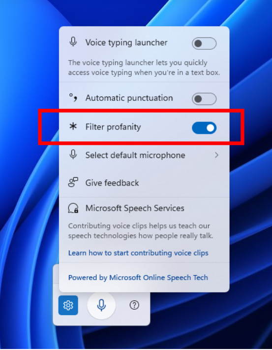 Раніше, коли користувач лаявся під час голосового введення, Windows автоматично замінювала лайливі слова зірочками. Тепер, щоб вимкнути фільтр нецензурної лексики, можна буде натиснути комбінацію клавіш Win + H і вибрати значок налаштувань. Там фільтр можна вимкнути, і система дасть змогу записувати лайку та передавати її в тексті без змін.