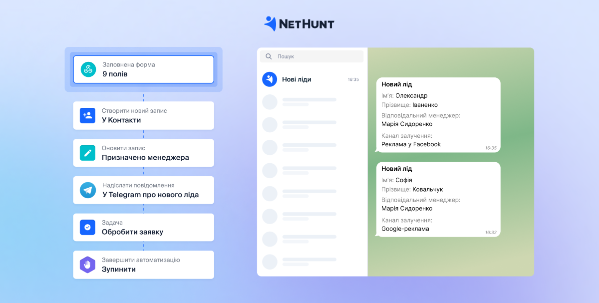 Автоматизація економить час і дозволяє зосередитися на клієнтах. Налаштуйте автоматичні сповіщення в Telegram, розсилки чи розподіл відповідальних, щоб прискорити роботу.