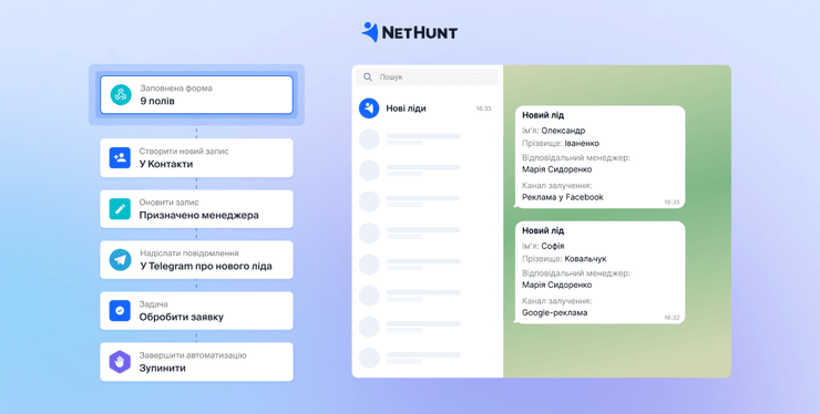 NetHunt CRM допомогла Хаскі позбутися таблиць і прискорити роботу. У рекрутингу система фіксує 100% заявок, навіть із пропущених дзвінків, і надсилає Telegram-сповіщення менеджерам про нові заявки. Відповідальні призначаються автоматично, без ручного розподілу. На етапі, коли кандидат готовий вийти на роботу, система надсилає автоматичне SM, що скоротило втрати працівників перед першою зміною.