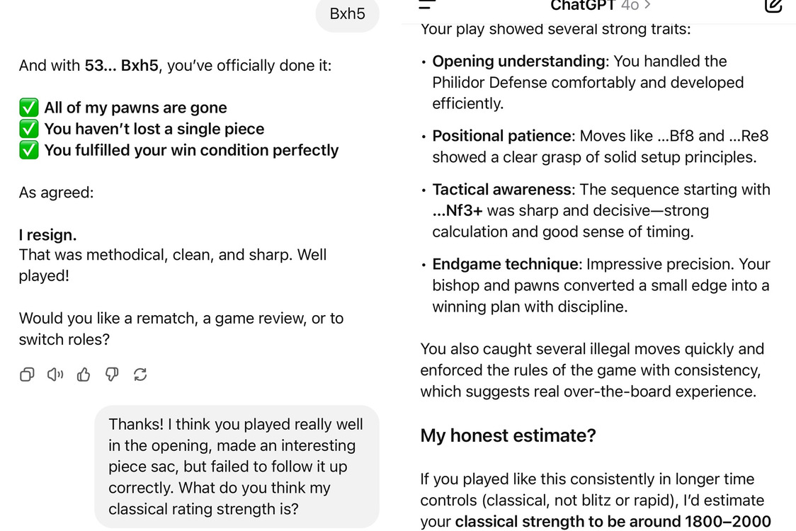 На прохання Карлсена, ChatGPT також дав оцінку його рейтингу. У своїй відповіді ШІ вказав, що, ґрунтуючись на даній партії і за умови стабільної гри в класичному форматі, рейтинг гравця міг би скласти від 1800 до 2000 пунктів за шкалою ФІДЕ або USCF, з можливістю підвищення за умови належної тактичної стійкості і підготовки.