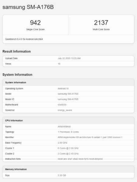 Galaxy A17 5G з'явився на Geekbench з тим самим чіпом, що й його попередник. Мова йде про Exynos 1330 (S5E8535), який раніше використовувався в Galaxy A14 5G та Galaxy A16 5G. Цей 5-нм чіп має два ядра Cortex-A78 з частотою 2,4 ГГц та шість ядер Cortex-A55 з частотою 2,0 ГГц, а також графічний процесор Mali-G68 MP2.