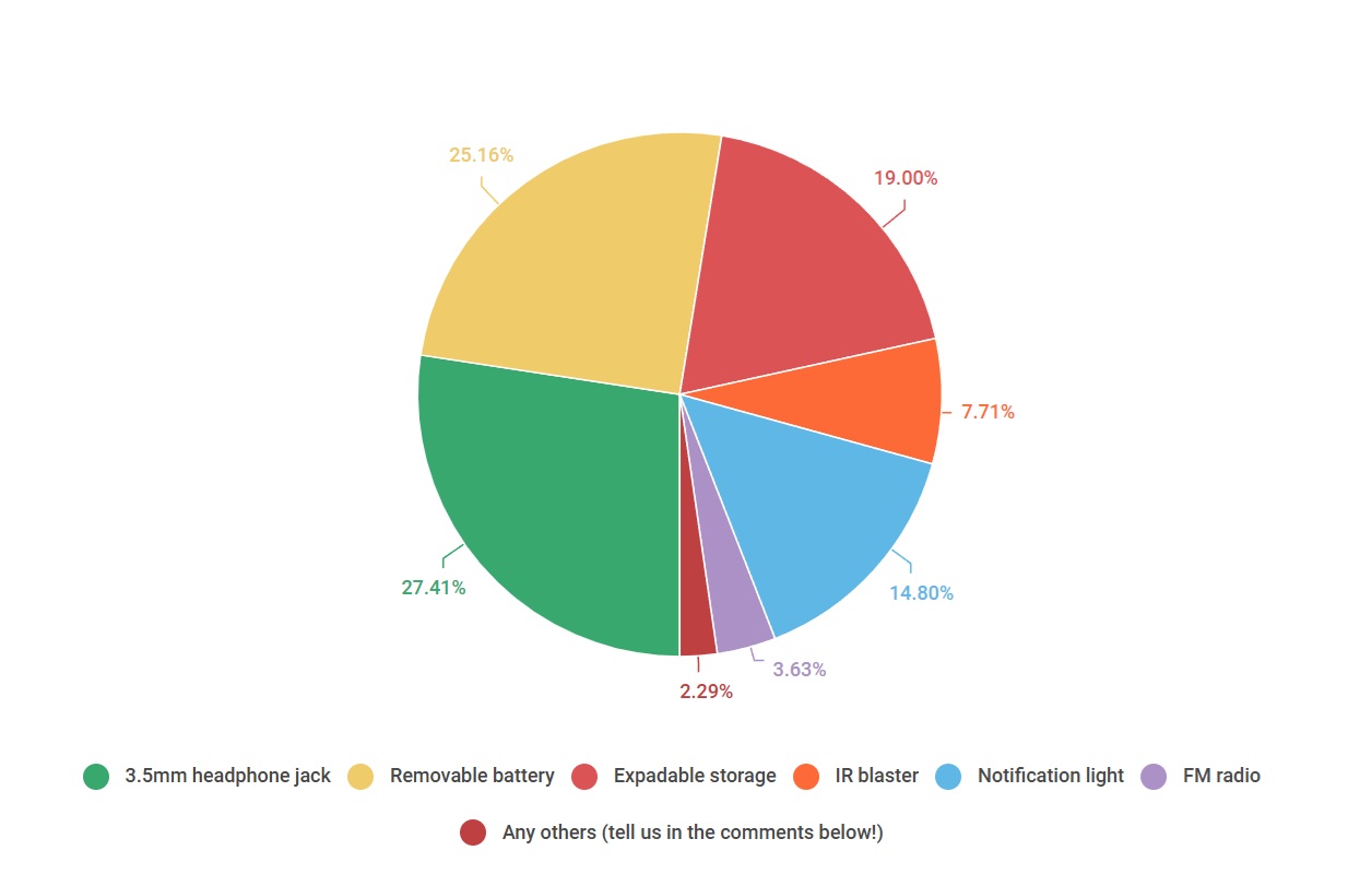 Результати показали, що майже рівна кількість людей жадають двох ключових функцій — це 3,5-міліметровий роз'єм для навушників і акумулятор, який легко замінюється. За них проголосували приблизно 27% і 25% респондентів відповідно.
