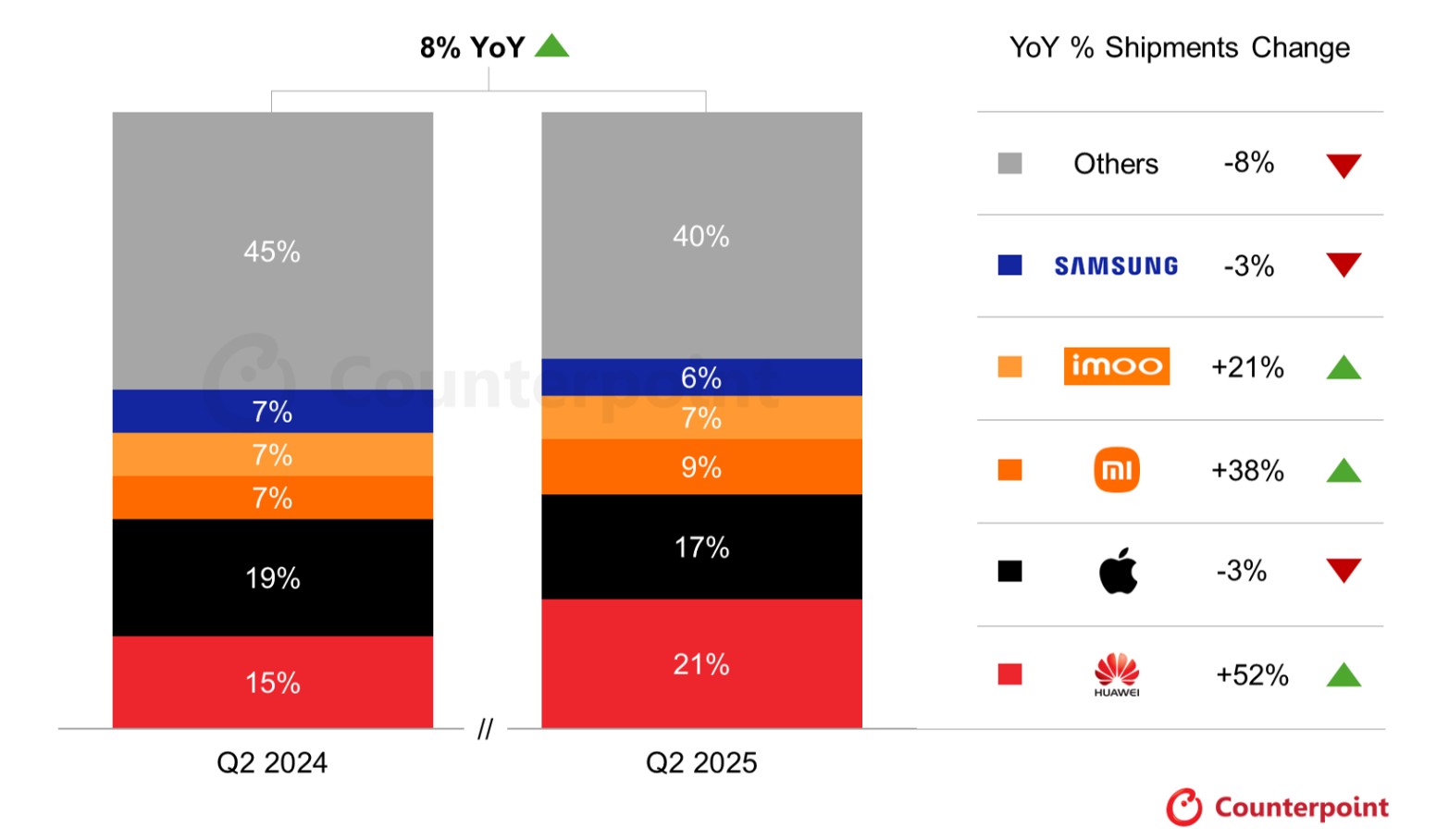У другому кварталі 2025 року глобальний ринок смарт-годинників уперше за п'ять кварталів показав зростання на 8%. Ключовим драйвером змін став китайський ринок на чолі з Huawei. Поставки компанії зросли на 52% у річному обчисленні, що дало їй змогу зайняти 21% сектору і вперше обігнати Apple, пише Counterpoint Research.