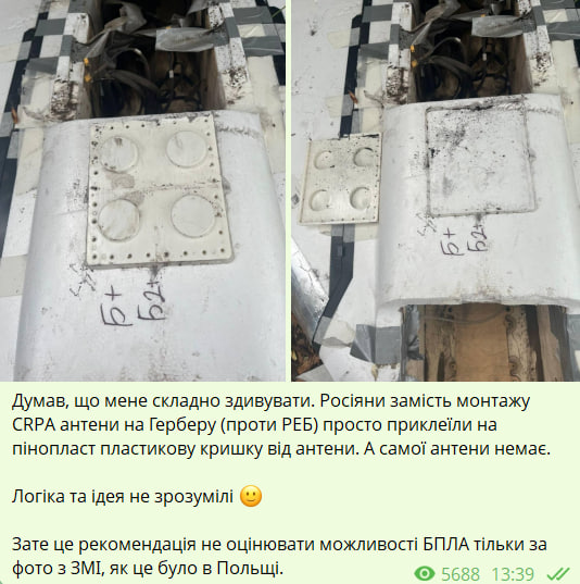 Експерт зазначив, що замість монтажу на "Герберу" CRPA антени, призначеної для захисту дрона від глушіння засобами радіоелектронної боротьби (РЕБ), росіяни просто приклеїли на пінопласт пластикову кришку від антени. При цьому самої антени на БПЛА не виявлено.