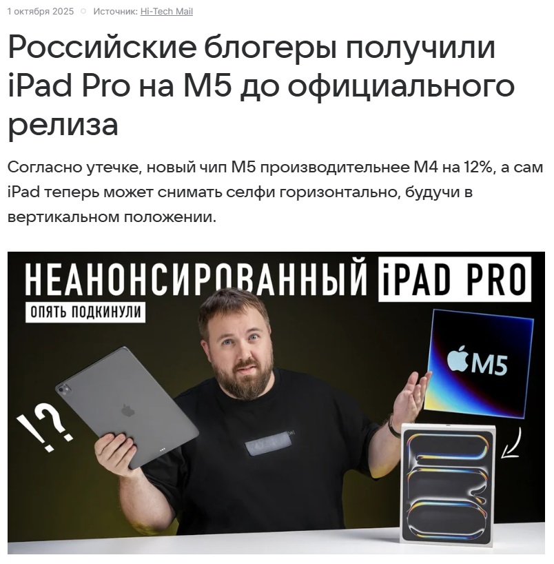 РосЗМІ писали, що новими Apple iPad Pro хвалилися відомі російські техноблогери Валентин Пєтухов (Wylsacom) і Сергій Романцев (Romancev768) і підтверджували, що вони отримали новий планшет Apple iPad Pro з чипом M5 до офіційного релізу.