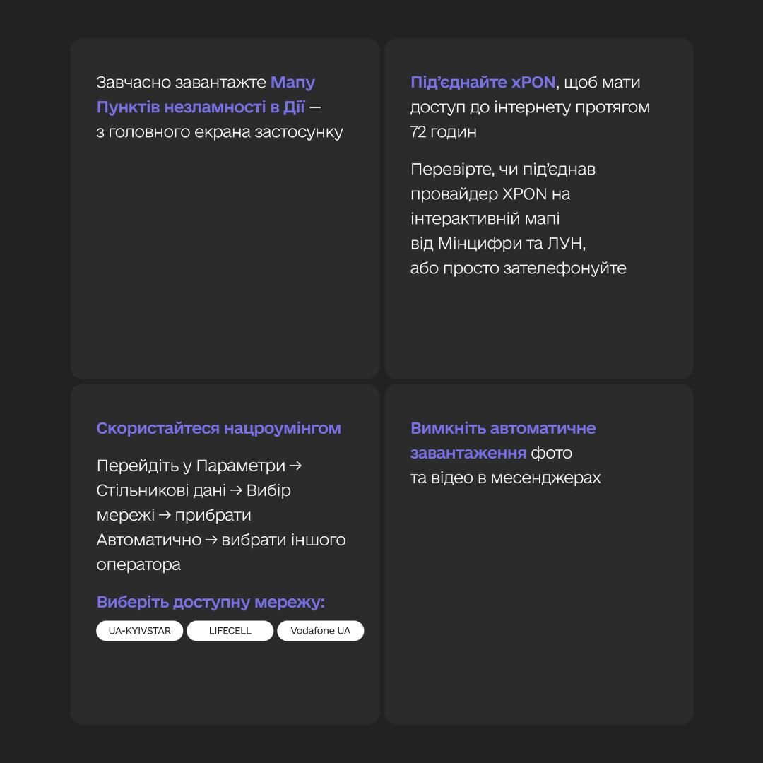 - під’єднати X-PON, щоб мати доступ до інтернету до 72 годин без електрики. Перевірити підключення можна на інтерактивній мапі від Мінцифри та ЛУН або у провайдера;
