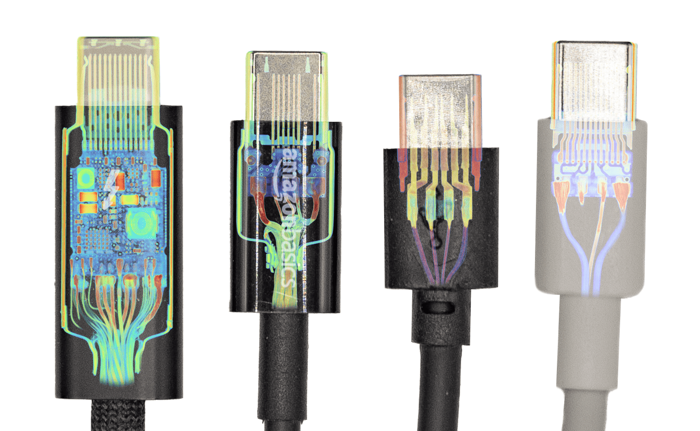 Скан різних кабелів USB-C. Крайній зліва — Apple Thundebolt 4 ($129), третій зліва — дешевий NiceTQ ($5)