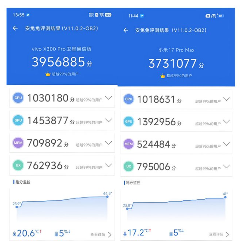 Видання посилається на результати бенчмарка AnTuTu для Vivo X300 Pro та Xiaomi 17 Pro Max. На відповідному скріншоті видно, що телефон Vivo набрав 3 956 885 балів, а Xiaomi — лише 3 731 077 балів.