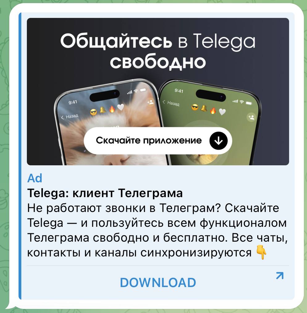 У російському ЗМІ "Агентство" підтверджували, що у Telegram почали рекламувати новий клієнт Telega. Його просувають за допомогою обіцянок щодо обходу блокувань у Росії і позиціонують як альтернативу офіційному Telegram. Користувачам обіцяють "роботу без обмежень" і можливість дзвонити без VPN.