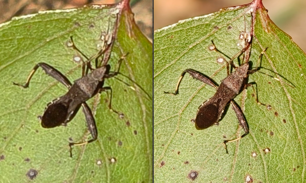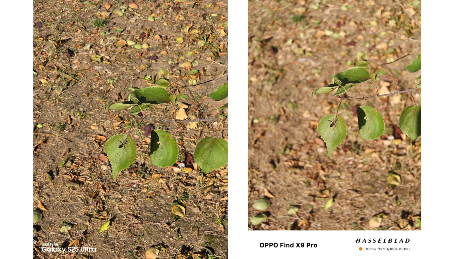 На фотографії з Oppo Find X9 Pro можна розгледіти найдрібніші текстури на аркуші та тілі комахи. Водночас на знімку з Galaxy S25 Ultra ці деталі практично невиразні і перетворюються на "мильну" кашу. Враховуючи, що саме деталізація є головним завданням телеоб'єктива, це повний провал для флагмана Samsung.