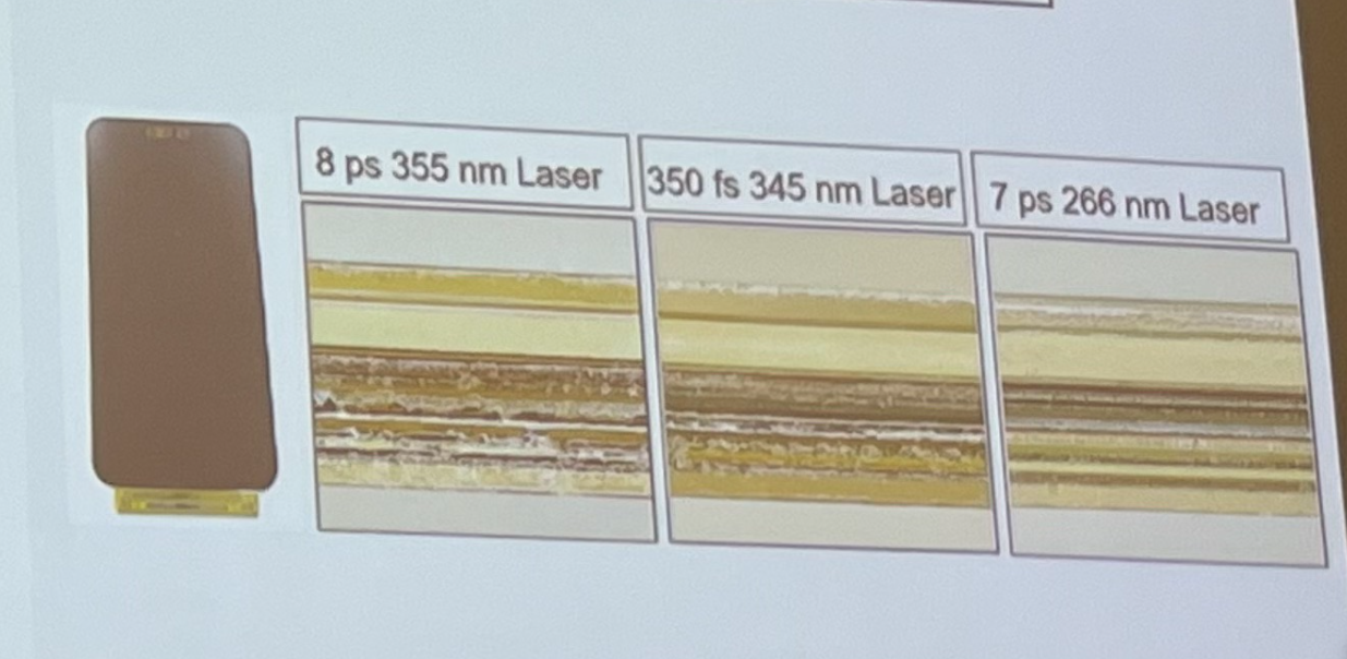 Як видно на знімку, при використанні УФ-лазера з довжиною хвилі 355 нм результат виходить дуже нерівним, на кордоні розділу шари дисплея нерівномірно розділені, і тому потрібна рамка навколо дисплея. При використанні 345 нм результат стає вже кращим, але цього все ще недостатньо для створення дисплея, повністю позбавленого рамок.