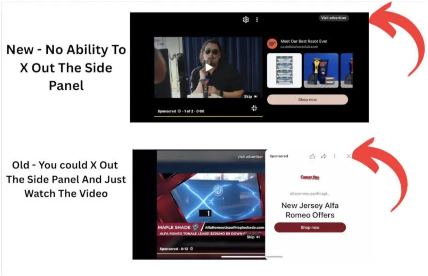 Рекламні вставки у відео часто супроводжуються банером, що закриває праву половину екрана. Він надає посилання на товар або послугу, що просувається. Якщо раніше розділ можна було закрити, то тепер ця можливість зникла, повідомляє користувач соцмережі X.