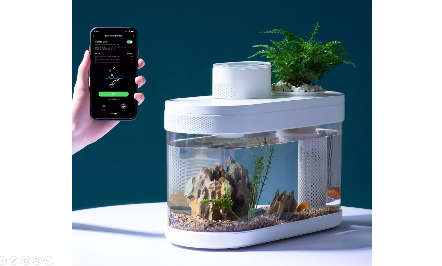 Ще один незвичайний пристрій — портативний акваріум. Це стильний міні-резервуар з вбудованим фільтром і LED-підсвічуванням, який легко поміщається на робочому столі, додаючи затишку. До того ж Xiaomi випустила розумну годівницю для риб (Mijia Smart Fish Feeder), якою можна керувати через додаток, і навіть ручку-тестер для перевірки якості води.