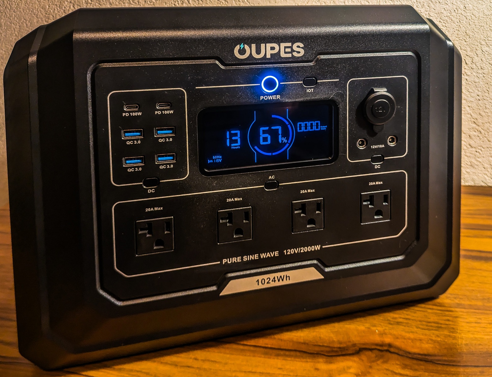 Вбудований дисплей точно показує, скільки часу пропрацює пристрій, виходячи зі споживаної потужності підключених пристроїв. На передній панелі розташовані п'ять розеток змінного струму, два порти USB-C потужністю 140 Вт, один порт USB-C потужністю 15 Вт і один порт USB-A потужністю 12 Вт. Станція може повністю зарядитися за 49 хвилин від стандартної побутової розетки, споживаючи при цьому близько 1200 Вт.
