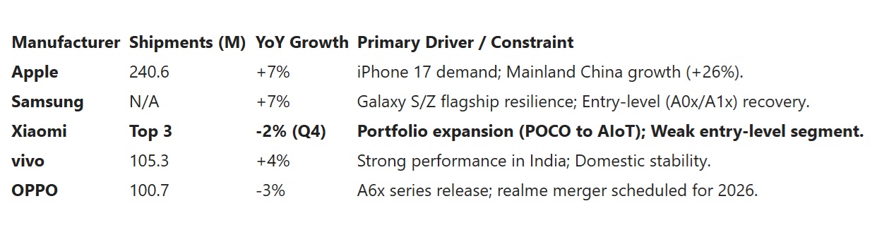 Скорочення поставок Xiaomi в 4 кварталі 2025 року (-2%) корелює зі згаданою слабкістю моделей початкового рівня, які найбільш вразливі до коливань цін на компоненти. Для протидії зниженню маржі стратегія повинна зміститися з суто об'ємного зростання на зростання вартості завдяки портфелям високоякісних Redmi і Xiaomi.
