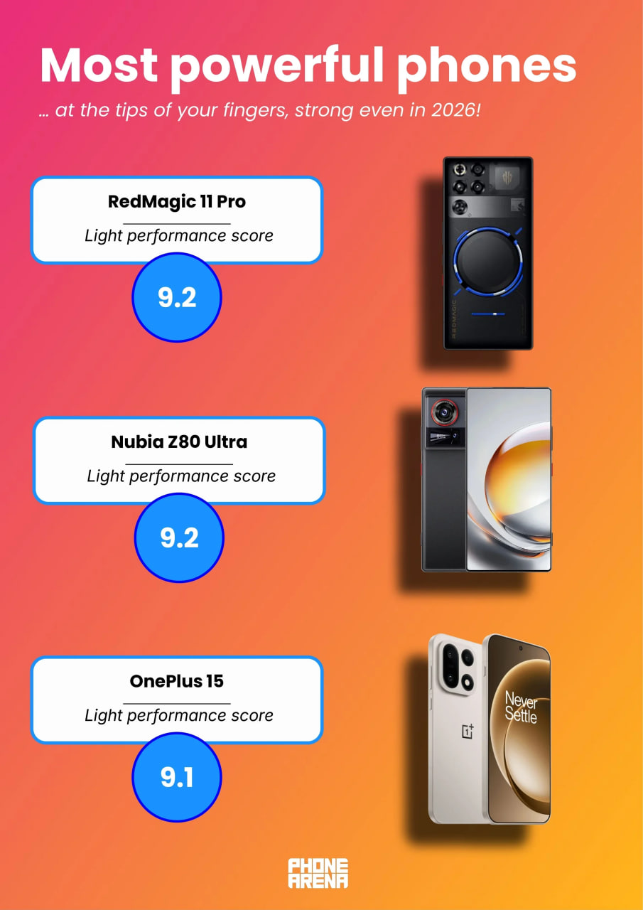 Перше місце посів RedMagic 11 Pro, набравши рекордну кількість балів у багатоядерному тесті Geekbench 6. За словами експертів, це стало можливим завдяки системі рідинного охолодження телефону, що дозволяє Snapdragon 8 Gen 5 Elite працювати швидше та з меншою температурою.
