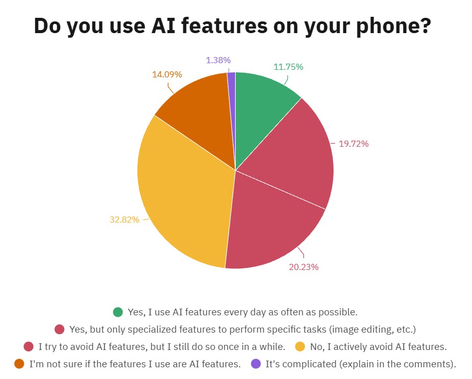 Майже кожен смартфон сьогодні має функції штучного інтелекту. Однак понад 50% читачів порталу Android Authority зізнались що намагаються уникати або повністю уникають використання ШІ.