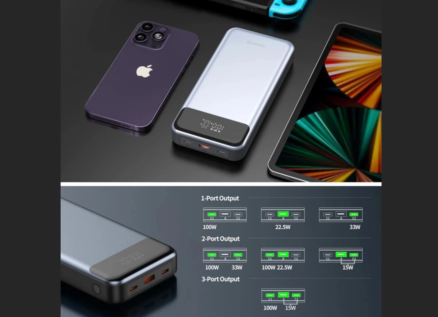 Збалансоване рішення для офісної роботи та поїздок. Модель пропонує ємність 30 000 мА-год і пікову вихідну потужність до 133 Вт. Головний порт USB-C видає до 100 Вт за протоколом Power Delivery, що робить його сумісним з більшістю сучасних лептопів. Корпус виконаний з негорючого матеріалу ABS+PC, підвищуючи безпеку експлуатації.