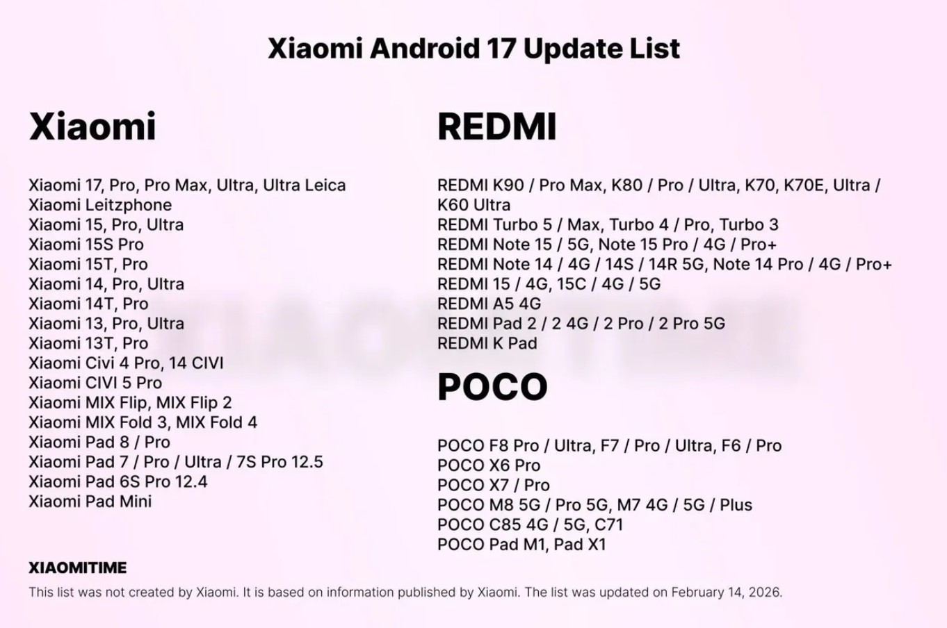 Пріоритет традиційно віддається топовим лінійкам. Android 17 отримають смартфони серії Xiaomi 17 (включно з версіями Pro, Pro Max і Ultra), а також моделі Xiaomi 15, 14 і 13 з усіма їхніми варіаціями.