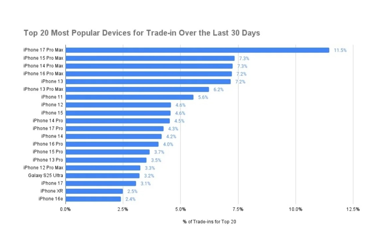 Традиційно списки трейд-ін очолюють застарілі моделі. Попадання свіжого преміального флагмана на першу сходинку вважається рідкістю. Другу позицію в актуальному антирейтингу посів iPhone 15 Pro Max з часткою 7,3%. Примітно, що практично весь топ-20 окупувала техніка Apple. Єдиним пристроєм іншого бренду в списку виявився флагманський Samsung Galaxy S25 Ultra, який набрав скромні 3,2%.