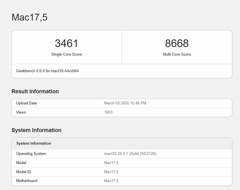 За даними Gadgets 360, модель MacBook Neo позначена в Geekbench як Mac17,5. Пристрій отримав 3 980 балів у одноядерному тесті та 10 105 балів у багатоядерному тесті.