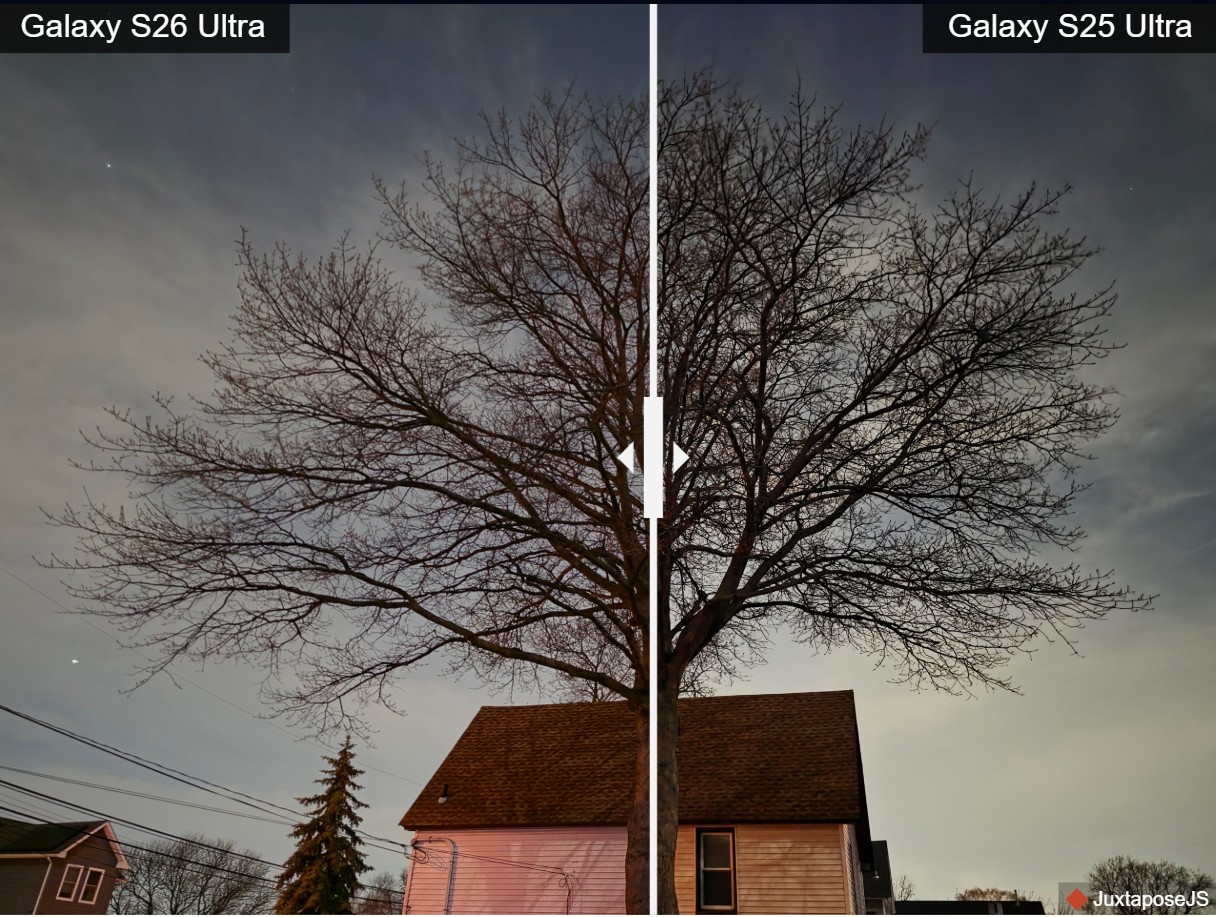 На нічних знімках дерев S26 Ultra зберіг значно більше деталей кори та текстури деревини, які на фото з S25 Ultra просто злилися в темні плями. Крім того, стара модель через довшу витримку часто спотворює кольори (наприклад, роблячи освітлений будинок неприродно помаранчевим), тоді як новинка зберігає високу точність передачі кольору навіть у темряві.