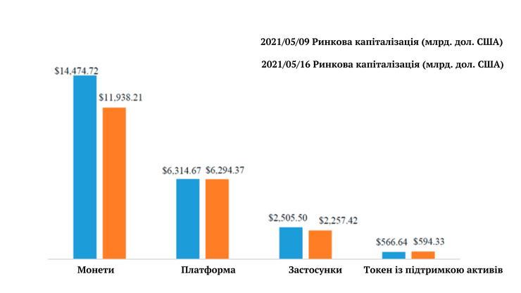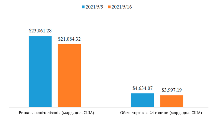Цього тижня загальна ринкова капіталізація для 100 найкращих криптовалют зменшилася на 15,93%, при цьому вартість 70 проектів також різною мірою знизилася. За даними coinmarketcap, станом на 16 травня 2021 р. загальна ринкова капіталізація криптовалют становила 2100,9 млрд дол. тиждень. Два криптовалютні проекти увійшли до топ-100 цього тижня, а саме CRV та PAX. Бткойн торгувався за ціною 45139,77 дол. США, що на 20,19% нижче, ніж його ціна минулого тижня. Ефіріум також "впав" і торгувався за ціною 3446,18 дол. США (-8,61%).