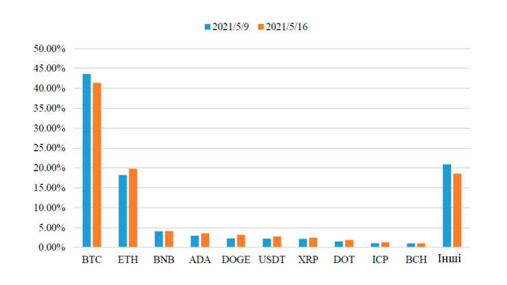 Ринкова вартість 10 найкращих криптовалют знизилася, розподіл ринкової частки залишався стабільним. 16 травня 2021 року загальна ринкова капіталізація 10 найбільших криптовалют становила 1711,0 млрд. Доларів США, зменшившись на 13,41% порівняно з минулим тижнем, склавши 81,44% від загальної ринкової капіталізації криптовалют, збільшившись на 2,38% порівняно з минулим тижнем. Частка ринкової вартості проекту TOP10 в основному стабільна. Домінування BTC становило 41,38%, зменшившись на 2,21% порівняно з минулим тижнем.