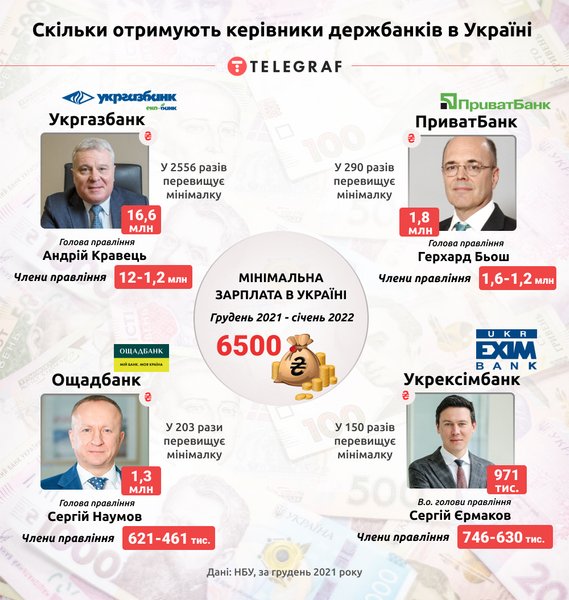 Найбільше у грудні минулого року заробив голова правління "Укргазбанку" Андрій Кравець — 16,6 млн грн. А найменше голова "Укрексімбанку" Євген Єрмаков — "всього" 971 тисячу гривень.