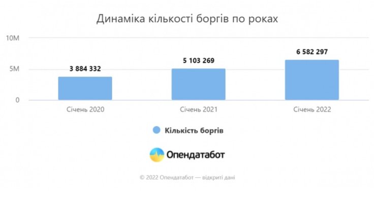 За минулий рік чисельність боргів українців зросла майже на 1,5 млн, а їхня сумарна кількість збільшилася на 29%. Про це свідчать дані з Єдиного реєстру боржників, повідомляє платформа для роботи з відкритими даними Опендатабот.