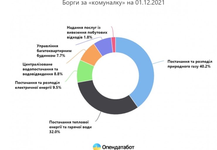 Загальний борг українців з комуналки станом на 1 грудня 2021 року становить 72,7 млрд гривень. З цієї суми 40,2% припадає на постачання та розподіл газу.