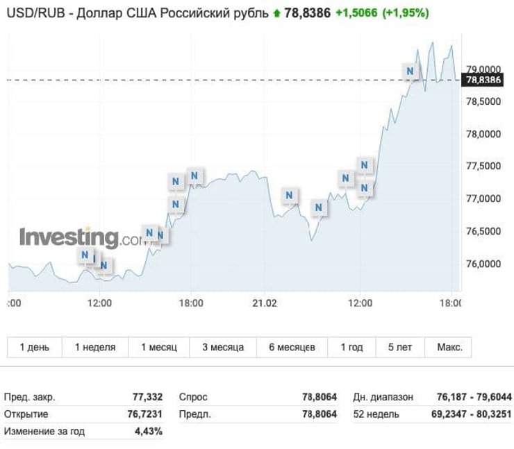Курс російського рубля до долара США впав на 1,95 рублів і становить 78,83 рублі за долар.