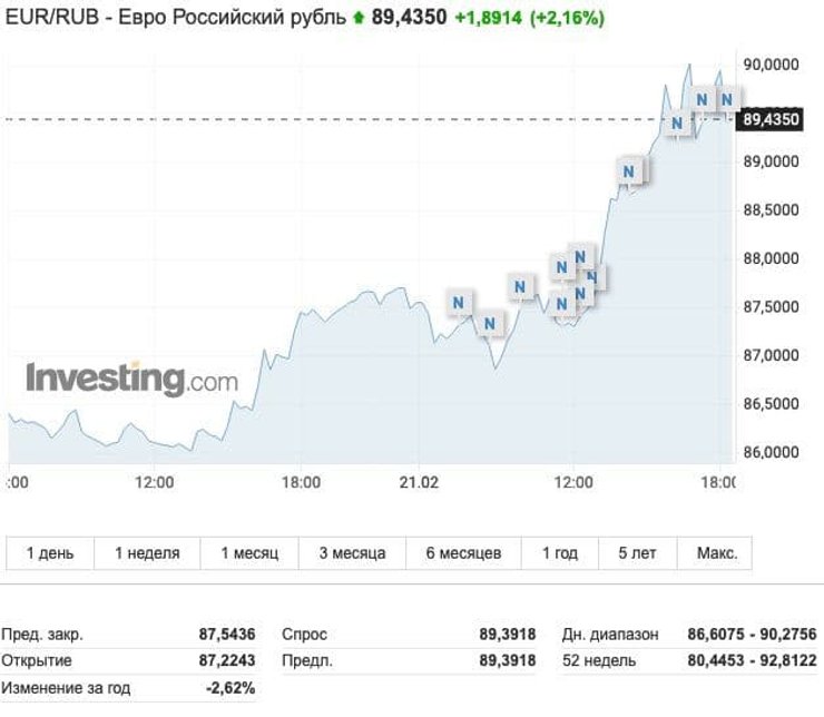 Ціна 1 євро наближається до 90 рублів і становить 89,4 рублі.