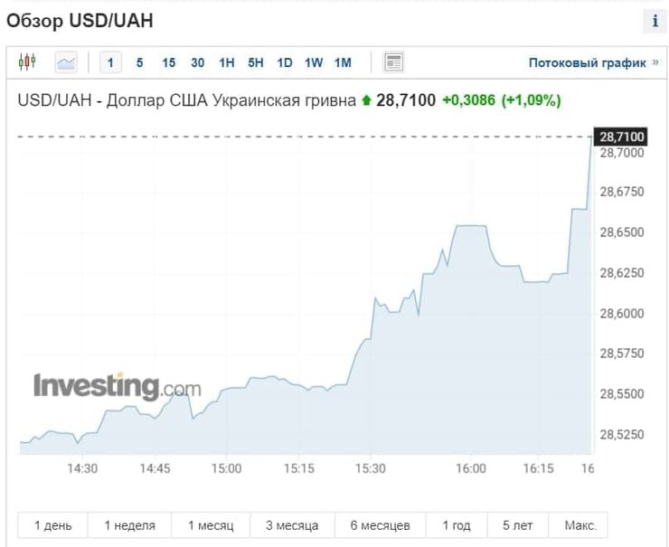 Гривня до долара на момент публікації новини впала на 1,09% — до 28,71. На початок торгів її вартість була 28,52 за 1 долар.