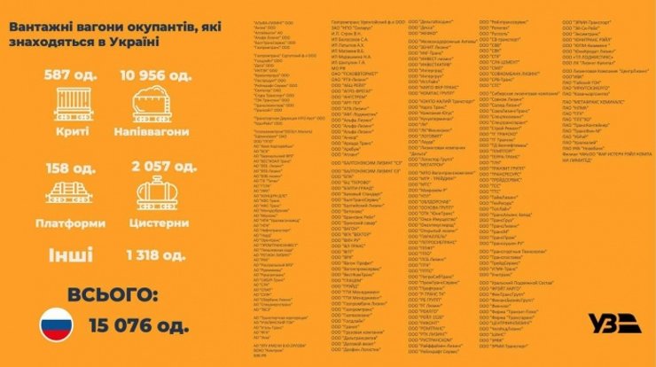 Зараз 15 тис. російських вагонів стоять на коліях України, вони належать 250 компаніям.