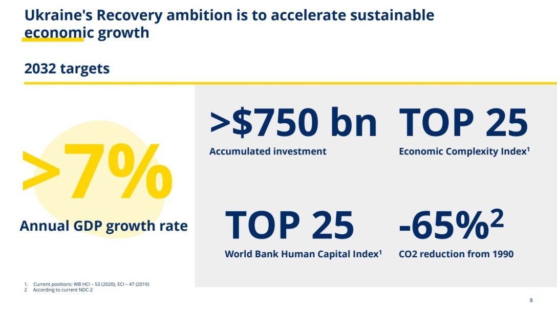 Прем'єр-міністр Денис Шмигаль 4 липня представив партнерам держави план відновлення України під час дводенної конференції в Лугано, Швейцарія. Передбачається, що за 10 років Україна використовує $750 млрд, щоб досягти низки цілей: понад 7% зростання ВВП на рік, піднятися як мінімум до 25-го місця із 47-го в рейтингу "Індекс перспектив економічної складності" та з 53-го в рейтингу "Індекс людського капіталу Світового банку".