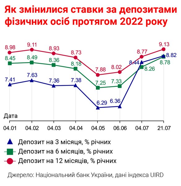 "Наразі серед клієнтів попит зміщується у бік короткострокових і середньострокових вкладів (3-6 місяців). По-перше, під час військового стану люди хочуть мати коротке часове плече доступу до коштів. По-друге, деякі банки навіть пропонують цікавіші умови на короткі вклади", — зазначає Дмитро Коваленко.