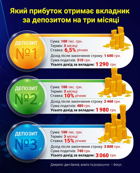 Варто пам'ятати, що дохід за депозитом оподатковується: податком на доходи фізосіб (ПДФО) 18% і військовим збором 1,5%. На найпростішому прикладі рахуємо дохідність вкладу.