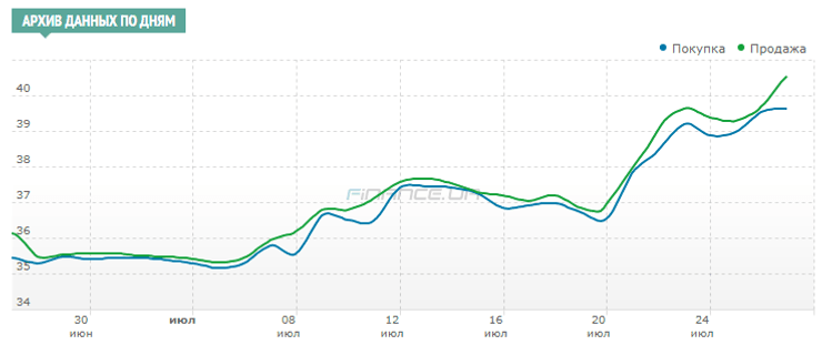 Євро: 39 – 40,4 гривні (26 липня — 38,37-39,9 гривні).