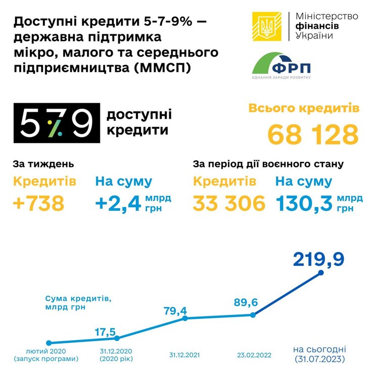 Станом на сьогодні, 31 липня, з моменту старту Державної програми "Доступні кредити 5-7-9%" суб’єкти підприємництва отримали від уповноважених банків 68 128 кредитів на загальну суму 219,92 млрд грн. Про це повідомляє пресслужба Міністерства фінансів України.