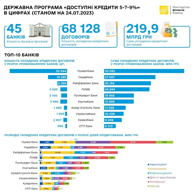 У Міністерстві фінансів України також повідомили, що за Державною програмою "Доступні кредити 5-7-9%" Фонд розвитку підприємництва (ФРП), єдиним учасником якого є Уряд України в особі Міністерства фінансів України, що координує усі аспекти діяльності Фонду уклав угоди про співробітництво з 45 банками.