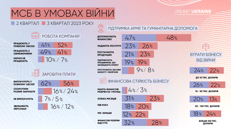 Європейська Бізнес Асоціація Unlimit Ukraine провела опитування серед фізичних осіб-підприємців щодо роботи в умовах війни. За даними асоціації, все більше представників малого та середнього бізнесу намагаються відновити повноцінну роботу після суттєвого скорочення активності у 2022 році, повідомляє ЕВА.