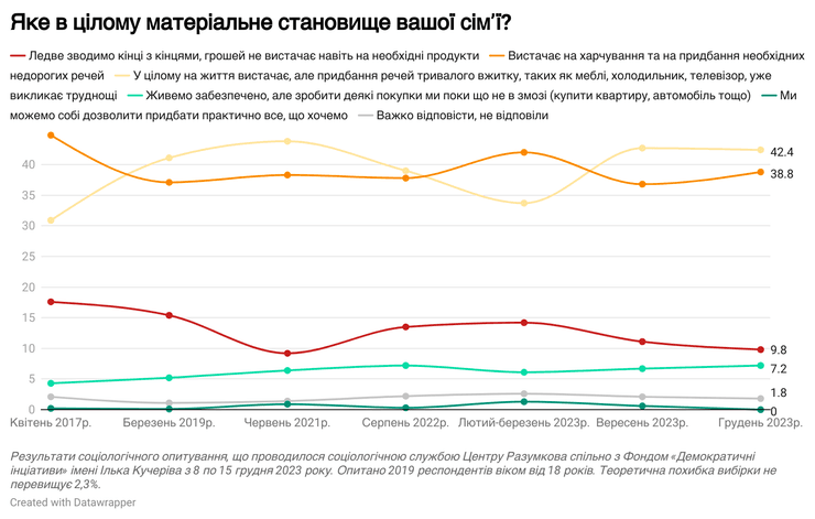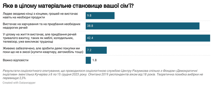 Більша частина респондентів, а саме 42,4% заявили, що грошей у цілому на життя вистачає, однак купівля меблів чи техніки викликає труднощі. Лише 7,2% опитаних відповіли, що живуть забезпечено, але поки що не можуть здійснити великі покупки як квартира чи автомобіль.