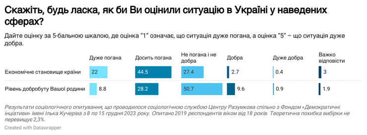 Зокрема, 50,7% опитаних українців зазначили, що рівень добробуту їхньої родини — "не поганий і не хороший". Лише 0,9% респондентів відповіли, що їхній добробут — дуже хороший.