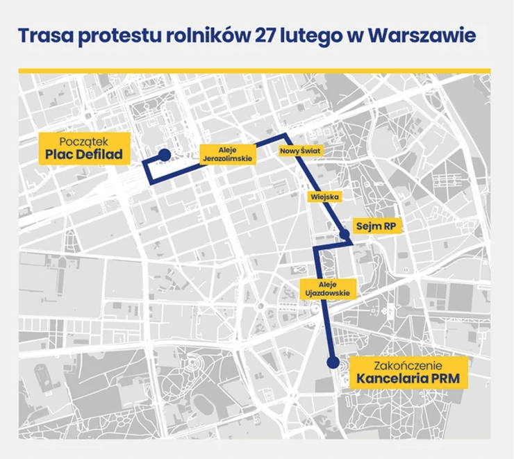 Фермери вимагають від польського уряду обмеження імпорту української агропродукції та виходу Польщі із European Green Deal, що накладає на них низку обмежень. Протестувальники заблокували дороги і вулиці у центрі столиці, а також розклали багаття на площі Дефілад і запалили фаєри, хоча організатори повідомляли, що марш буде мирним. За деякими повідомленнями, очікується, що в акції візьмуть участь приблизно 10 тисяч фермерів.