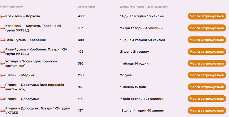 На в’їзд в Україну станом на 14:00 5 березня черга на деяких пунктах перетину кордону затримується більше ніж на місяць, за інформацією сайту "єЧерга".