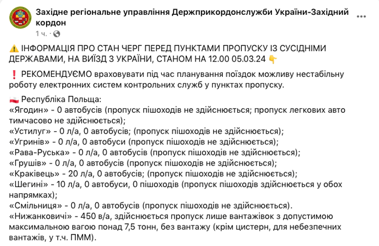 Станом на 13:00 5 березня виїзд з України відповідно до повідомлення Західного регіонального управління Держприкордонслужби України виглядає у такий спосіб: