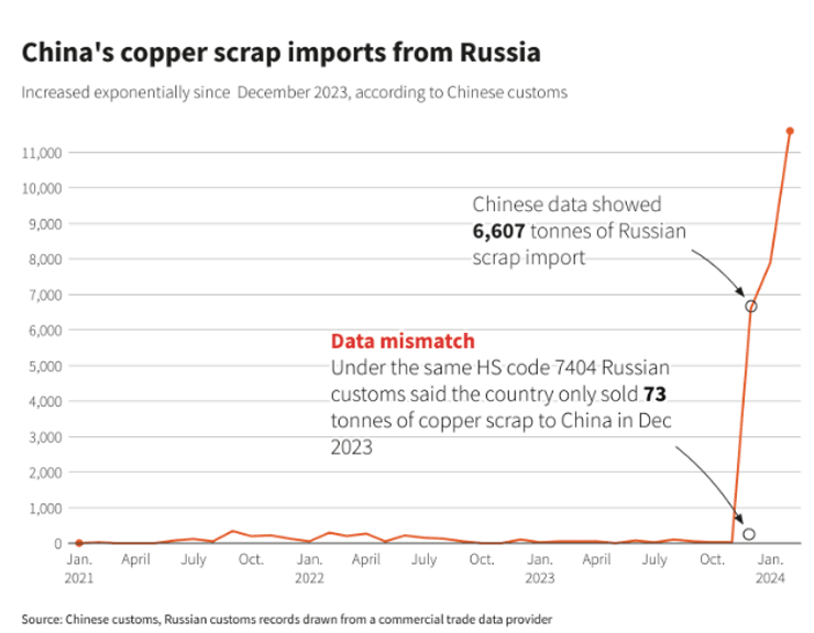 У Китаї цифри свідчать про те, що КНР закупила в Росії набагато більше брухту. Водночас Російська мідна компанія (РМК) на запит Reuters показала проданий обсяг брухту, експортованого до Китаю, зовсім незначним і прокоментувала таку невідповідність тим, що Федеральна митна служба Росії "тимчасово не надає дані щодо зовнішньої торгівлі". Агентство підкреслює, що РФ припинила публікацію такої статистики ще у квітні 2022 року, незабаром після повномасштабного вторгнення Росії в Україну.