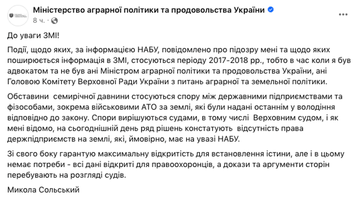 Як зауважив Сольський у відповіді, опублікованій на Facebook міністерства, яке очолює фігурант справи, йдеться про суперечку між державними підприємствами та фізособами, зокрема військовими-атовцями, за землі, які було передано їм у володіння відповідно до закону, як стверджує міністр.
