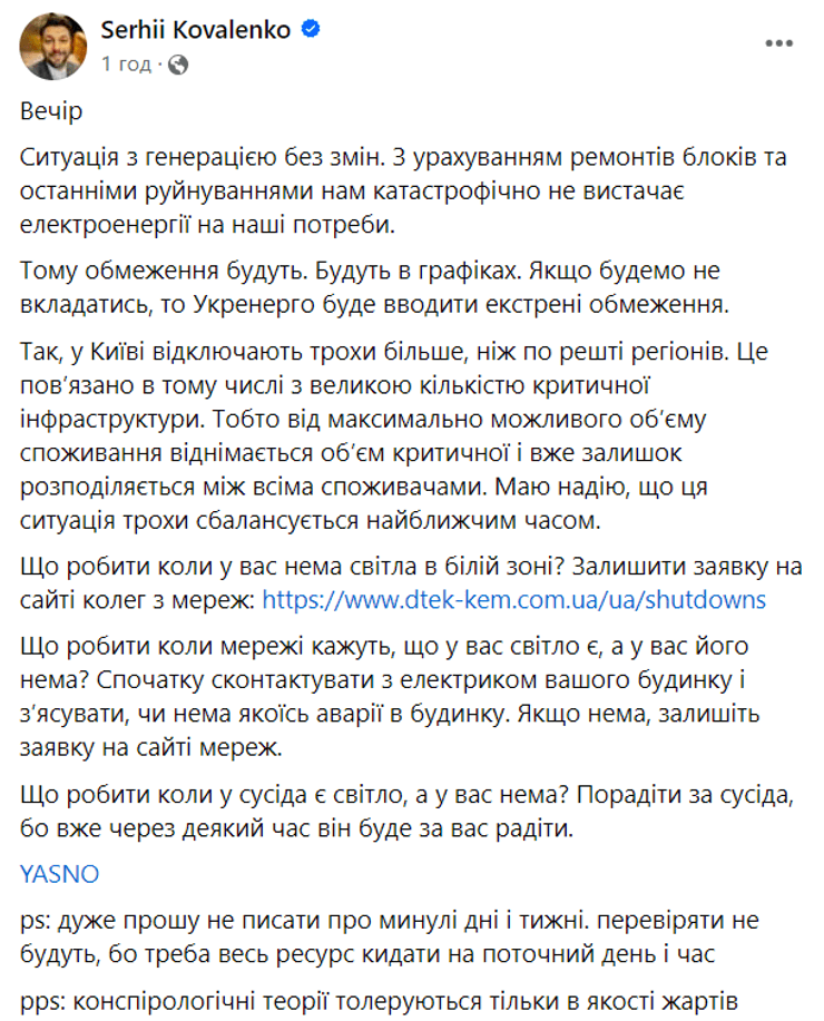 "Тому обмеження будуть. Будуть в графіках. Якщо будемо не вкладатись, то "Укренерго" буде вводити екстрені обмеження, — написав він.